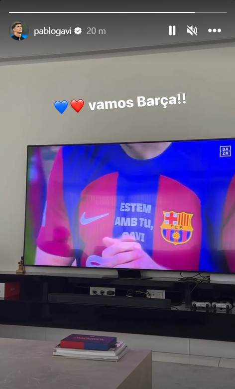 Gavi, que será operado na sequência de uma rotura do ligamento cruzado anterior do joelho direito, não foi esquecido neste encontro: os companheiros envergam camisola com mensagem especial em catalão: estem amb tu, Gavi (estamos contigo, Gavi).