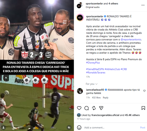 O goleador luso, ainda assim, rejeitou a alcunha na zona de entrevistas rápidas e destacou o mérito do coletivo: «A bola chega-me em condições, os meus colegas dão-me passos perfeitos.» Ronaldo Tavares dedicou o 'hat-trick', a vitória e a bola de jogo ao médio Gustavinho, que falhou a partida devido à morte da mãe.
