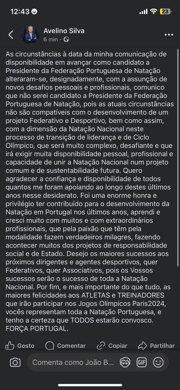 «A circunstâncias à data da minha comunicação de disponibilidade em avançar como candidato a Presidente da Federação Portuguesa de Natação alteraram-se, designadamente, com a assunção de novos desafios pessoais e profissionais, comunico que não serei candidato a Presidente da Federação Portuguesa de Natação, pois as atuais circunstâncias não são compatíveis com o desenvolvimento de um projeto federativo e desportivo, bem como assim, com a dimensão da Natação Nacional neste processo de transição de liderança e de Ciclo Olímpico, que será muito complexo, desafiante e que irá exigir muita disponibilidade pessoal, profissional e capacidade de unir a natação nacional num projeto comum e de sustentabilidade futura», justifica Avelino Silva na sua mensagem em que ainda agradece a confiança e disponibilidade a todos os que os apoiaram nos últimos anos, até porque na altura da sua candidatura já referira que não iria recandidatar-se a presidente da associação da Madeira.