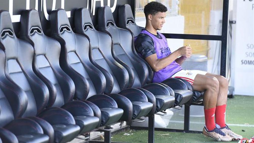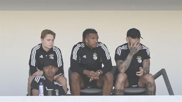 Apesar de suspenso, o defesa-central argentino seguiu com a comitiva para o Algarve e assistiu ao jogo na bancada, onde vibrou com os golos das águias na bancada, ao lado dos companheiros Schjelderup (à esquera), Cher Ndour e Kokubo (em baixo).