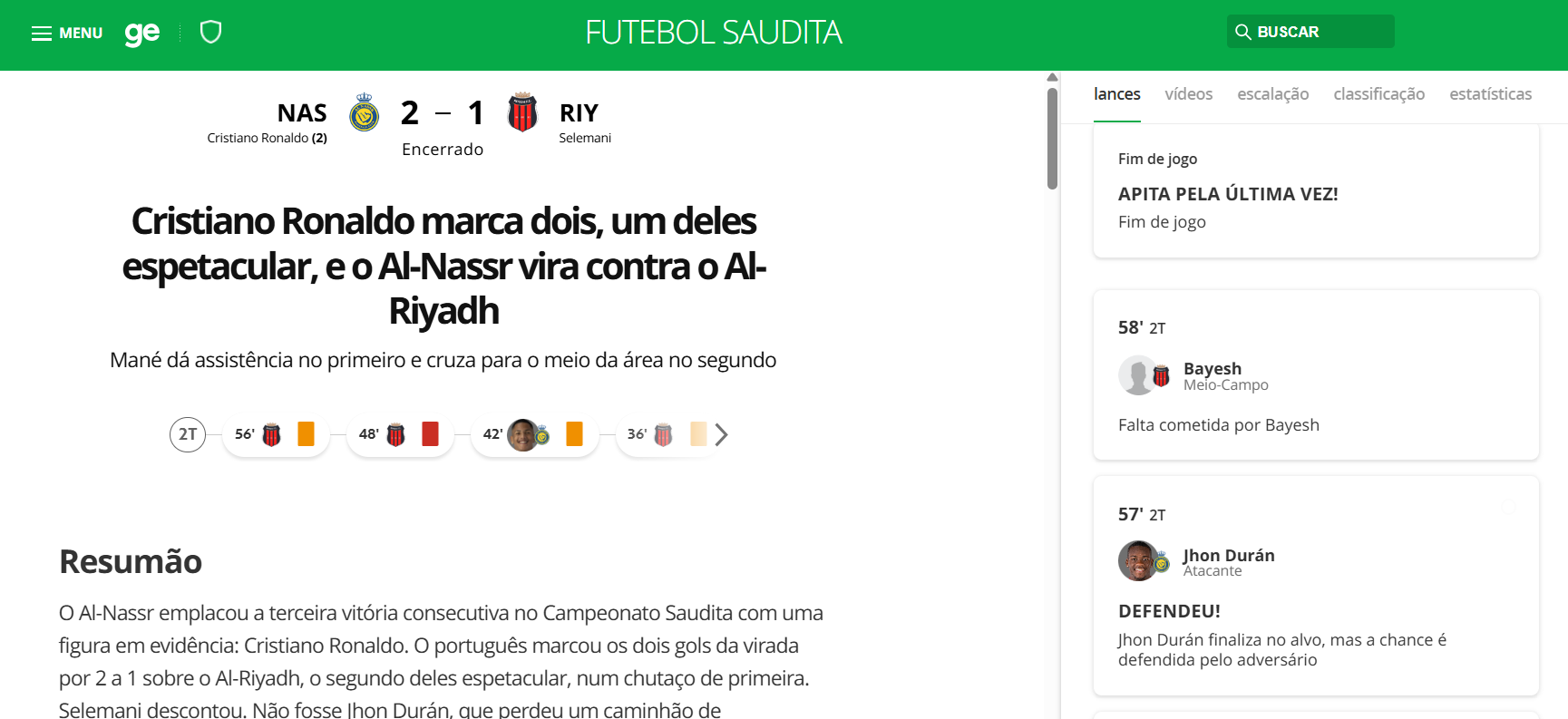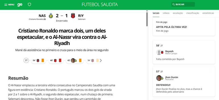 Cristiano Ronaldo bisou na reviravolta do Al Nassr na receção ao Al Riyadh (2-1), garantindo o triunfo e, consequentemente, a aproximação ao segundo lugar da liga saudita, ocupado pelo Al Hilal, de Jorge Jesus.