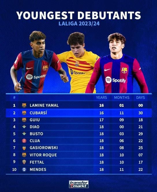 Além das três primeiras posições, os catalães conseguem ainda colocar um quarto jogador no top-10, o atacante brasileiro Vítor Roque, que se estreou na La Liga com 18 anos, 10 meses e sete dias, sendo o oitavo desta lista, que atesta que o Barcelona de Xavi Hernández é a equipa que mais aposta em jovens.