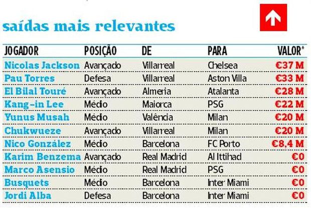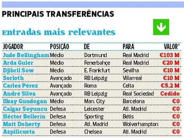 Em sentido contrário, chegaram Gundogan, ao Barcelona, a custo zero, e Bellingham e Arda Guler, ao Real Madrid, que custaram cerca de metade dos €250 milhões investidos pelos clubes espanhóis, longe dos €1,4 mil milhões da Premier League, dos €550 M da Serie A e do mesmo montante da Bundesliga.