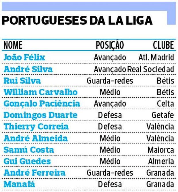 De novo a correr por fora, o Atlético de Madrid, liderado por Diego Simeone desde 2011, tentará aproveitar os deslizes daqueles dois colossos - por definir está o futuro de João Félix, que não deve passar pelos colchoneros. O avançado é um dos 12 portugueses que estão nesta altura ao serviço de equipas espanholas.
