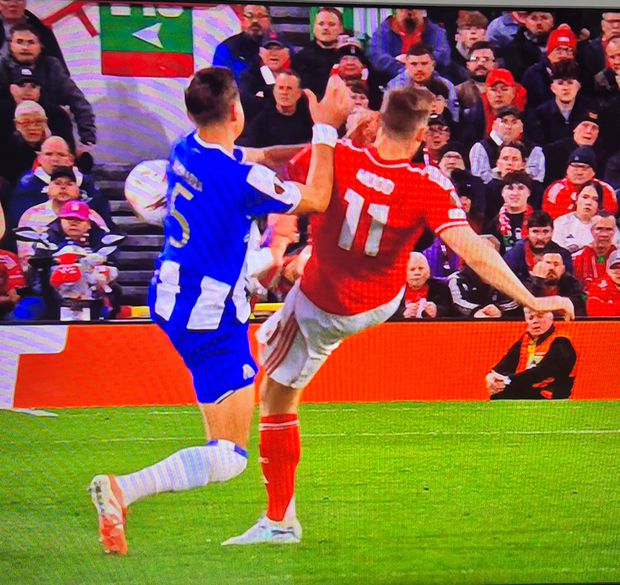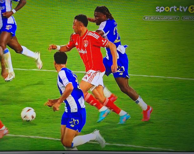 18' No golo do Nottingham, a recuperação de bola foi feita sem qualquer infração, na ocasião foi Neco Williams que tirou a bola com o seu pé esquerdo, desarmou Alberto, não o pontapeando ou rasteirando. Tudo legal na recuperação, construção e finalização da jogada.