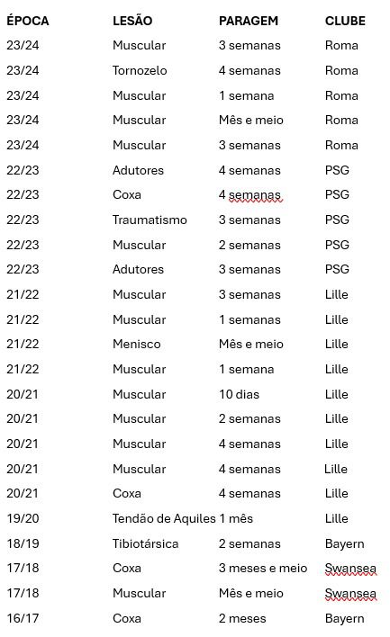 Nos últimos anos, o campeão europeu por Portugal em 2016 passou por um calvário de lesões que parece não ter fim à vista. Em setembro de 2023, A BOLA dava conta do número de dias e jogos que Renato Sanches já tinha perdido na carreira por lesão. Não seria a última vez que o centrocampista estaria lesionado ao serviço da equipa romana, no início da temporada liderada por José Mourinho.