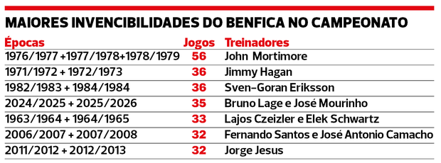A melhor sequência da história do Benfica ficará, se não perder até final de 2025/2026, para 2026/2027, pois há quase meio século (1976/77, 1977/78 e 1978/79) os encarnados estiveram nada menos de 56 jornadas sem perder. Foram derrotados em Setúbal pelo Vitória (1-2) na jornada 5 de 1976/1977 e só voltaram a sê-lo na ronda 2 de 1978/79 (0-2 pelo FC Porto, nas Antas). E foram vice-campeões sem qualquer derrota em 1977/1978, atrás do FC Porto.