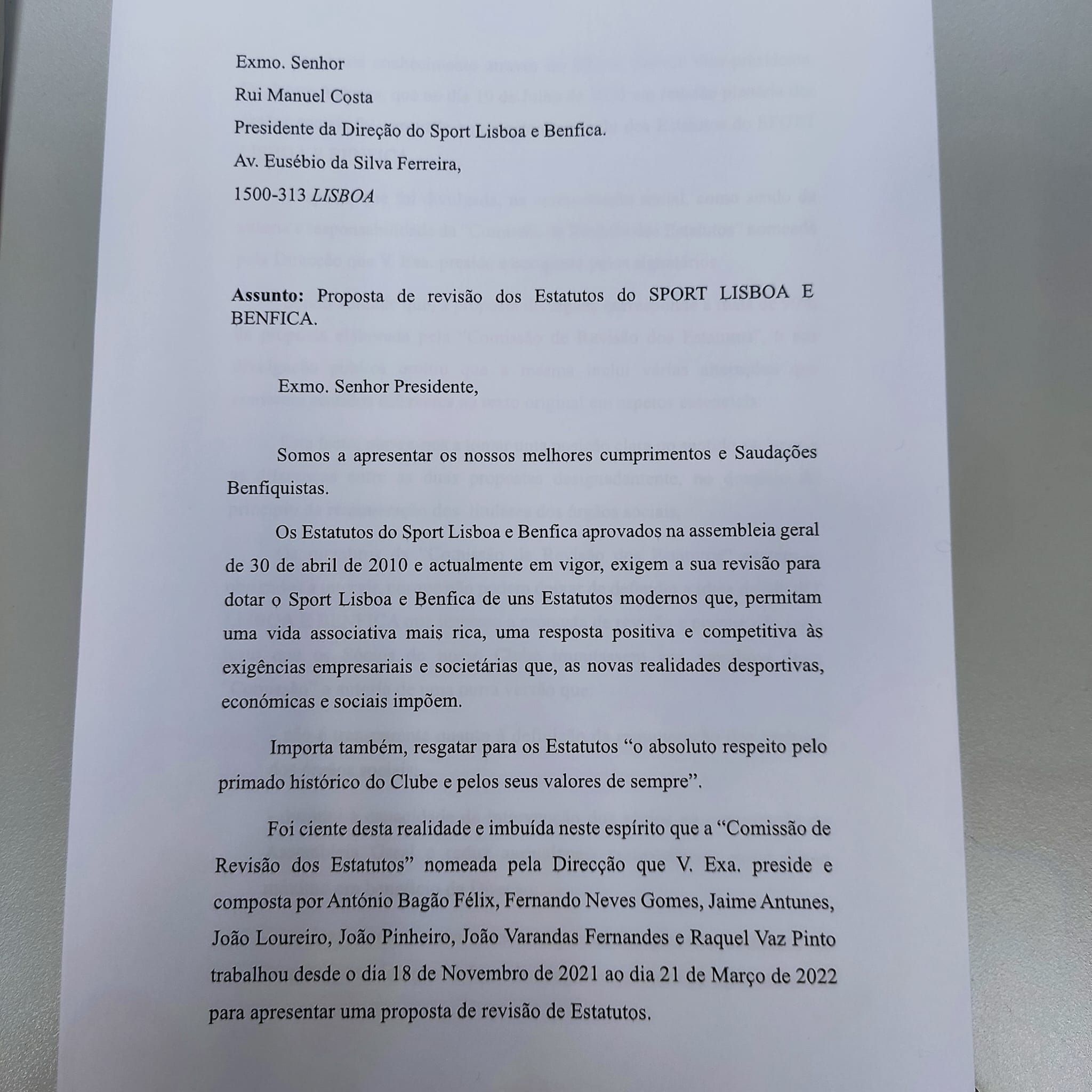 NOTA: A BOLA apurou, entretanto, que Rui Costa respondeu em agosto à Comissão de Estatutos, em carta enviada por mail, através do chefe de gabinete, na qual assume que a proposta de revisão de estatutos é da Direção.