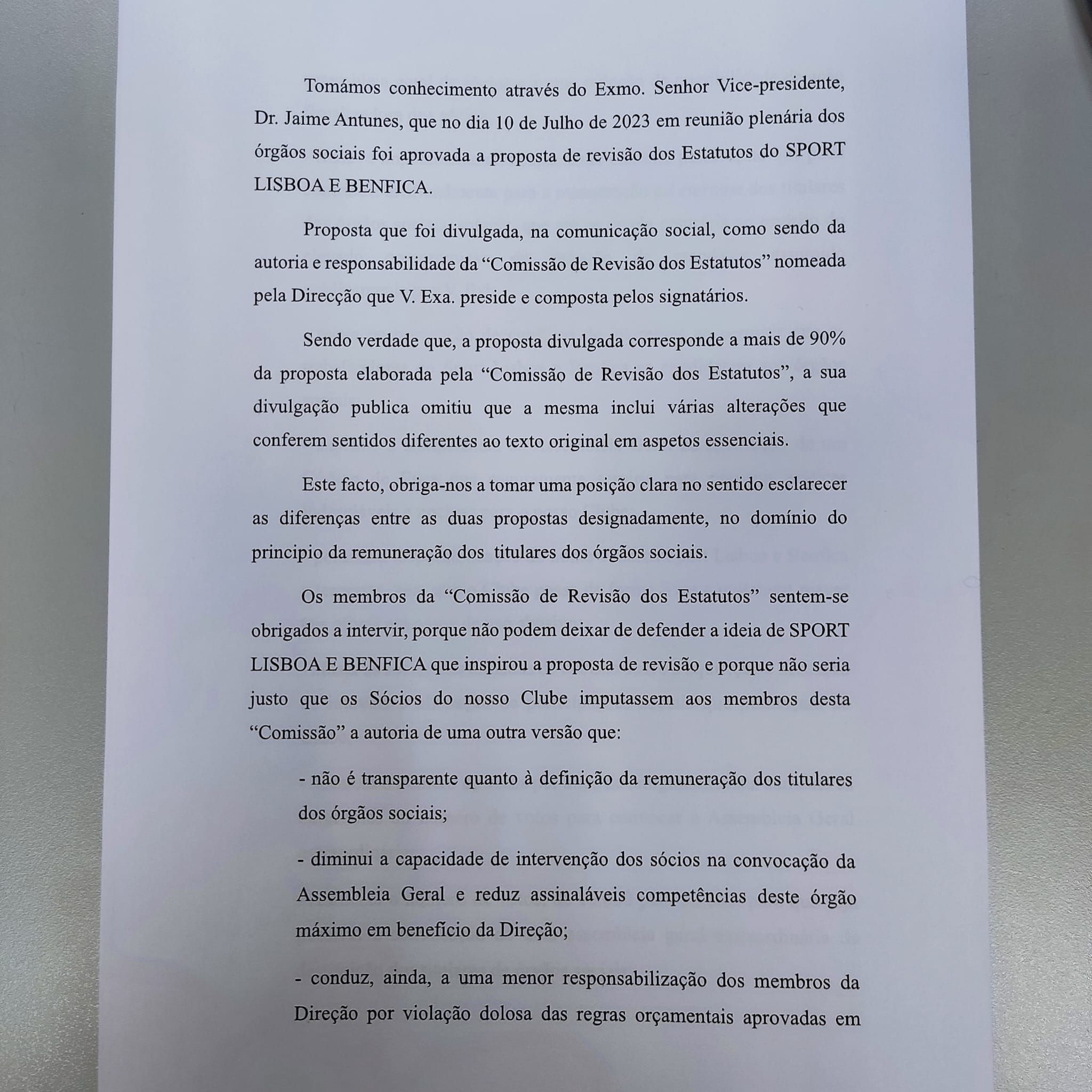 A mesma dá conta que o vice-presidente Jaime Antunes informou a comissão «que no dia 10 de julho de 2023 em reunião plenária dos órgãos sociais foi aprovada a proposta de revisão dos estatutos», depois «divulgada, na comunicação social, como sendo da autoria da comissão de revisão», que, recorde-se, foi nomeada pela própria Direção presidida por Rui Costa.
