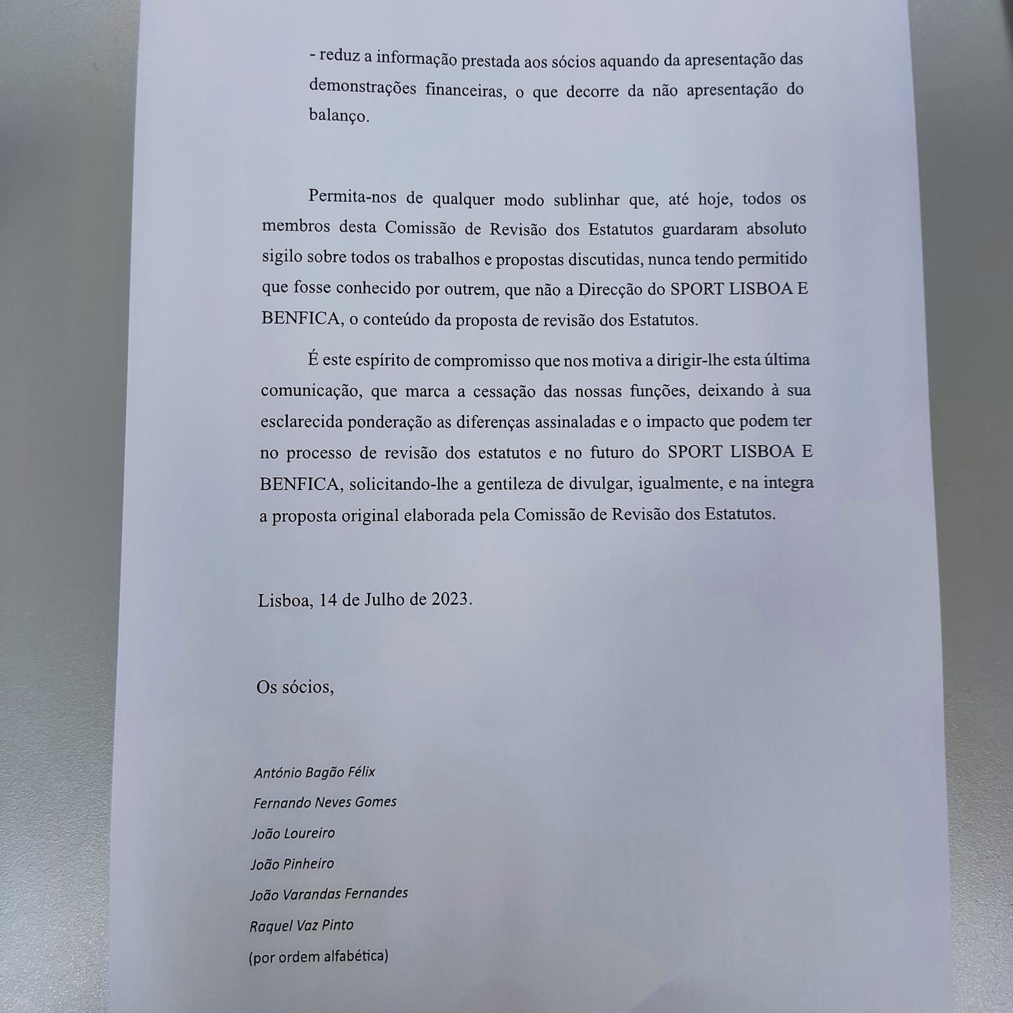 Assinada por António Bagão Félix, Fernando Neves Gomes, João Loureiro, João Pinheiro, João Varandas Fernandes e Raquel Vaz Pinto – Jaime Antunes, vice-presidente do Benfica, foi o único elemento da comissão a não a subscrever -, a carta foi enviada a 14 de julho deste ano, como A BOLA deu conta na altura, e encerrava críticas várias à forma como o processo teve sequência depois de a comissão ter entregue o resultado do seu trabalho à Direção a 21 de março de 2022 - «A Direção vai agora analisar o documento e dar seguimento ao processo», anunciava então o clube da Luz no site oficial.
