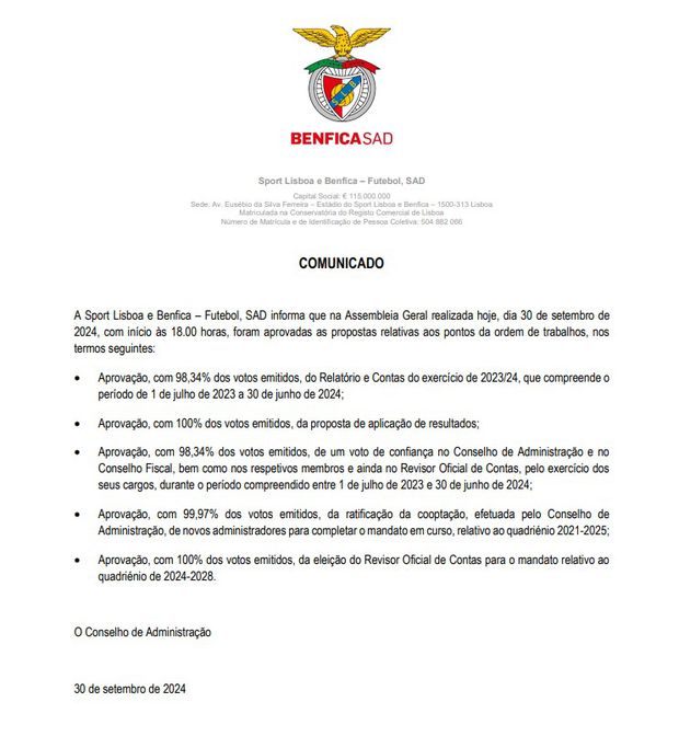 Em comunicado publicado na CMVM a SAD dos encarnados informa que foram aprovadas as propostas que constavam dos quatro pontos da ordem de trabalhos.