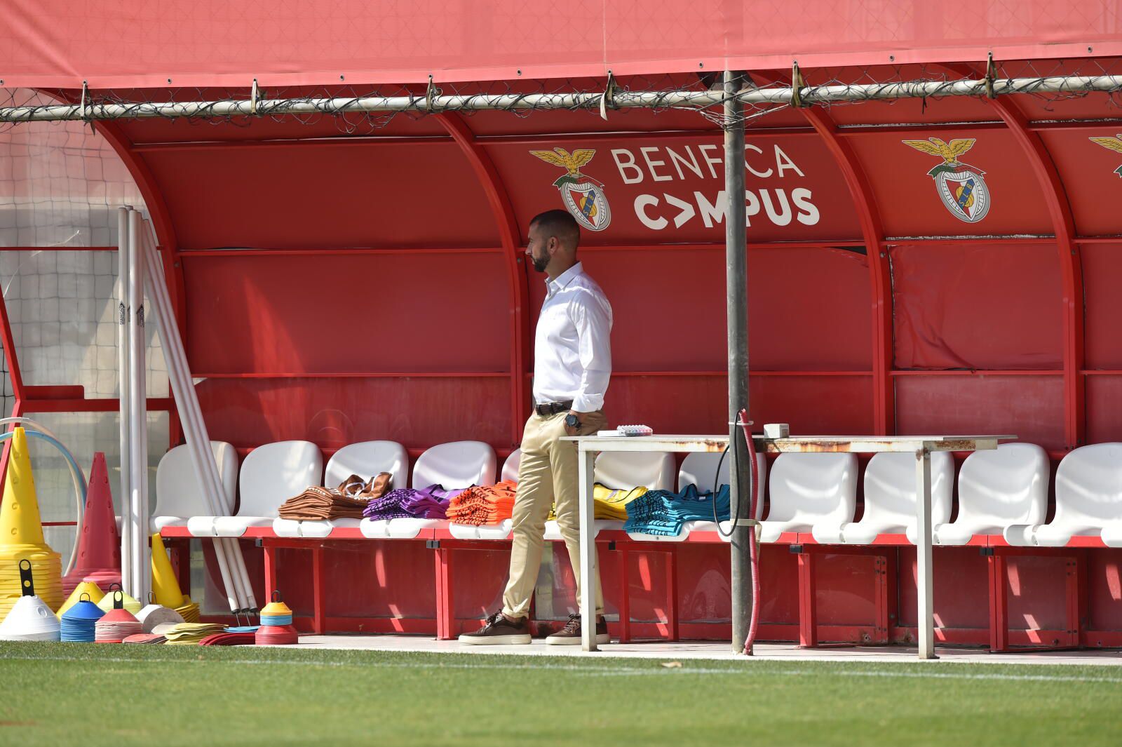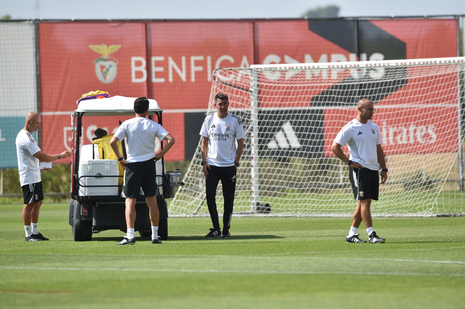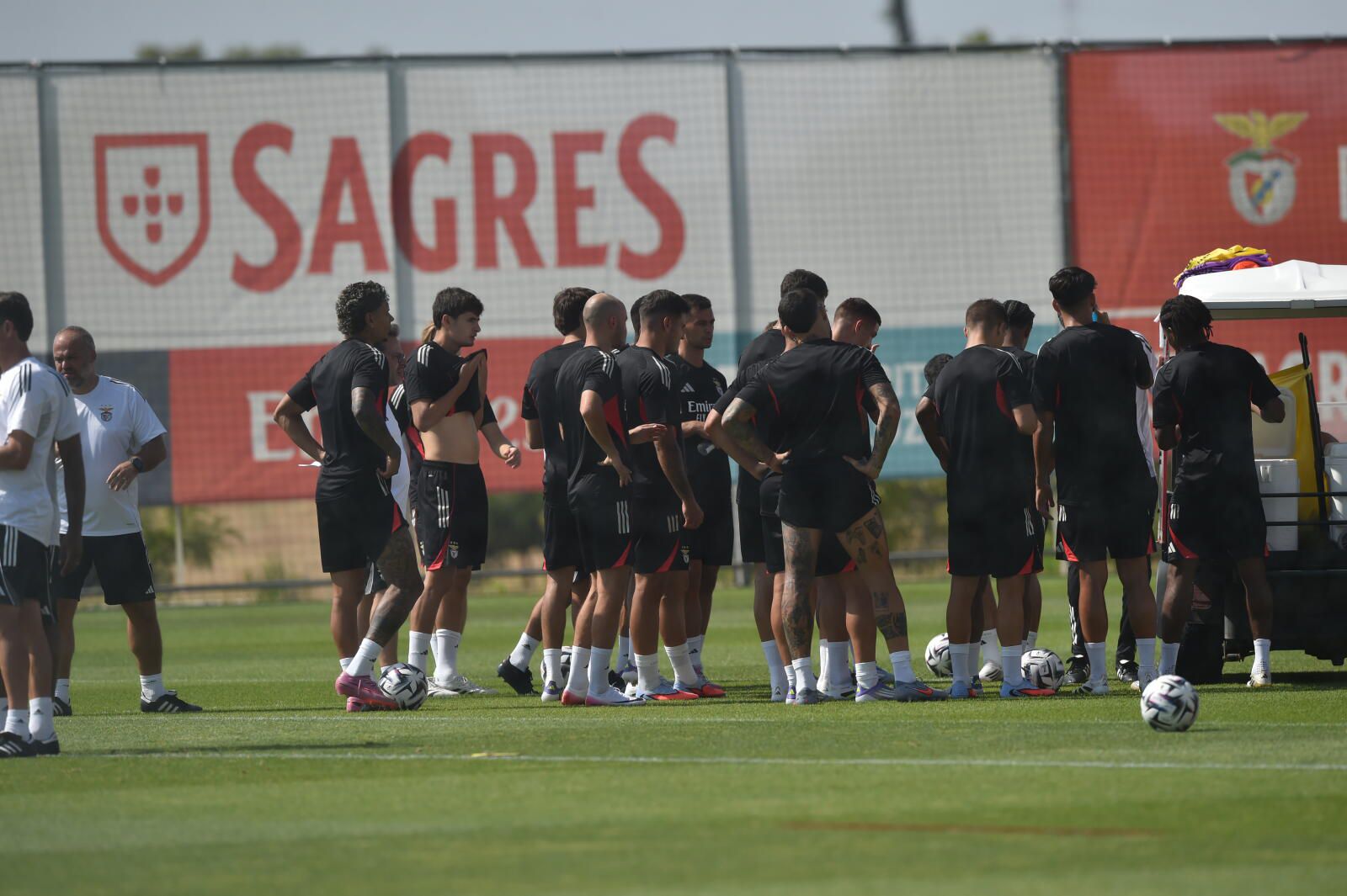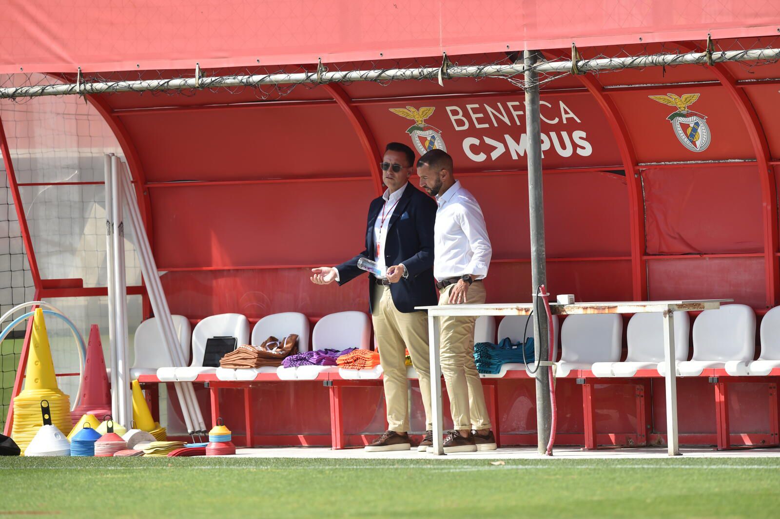 O diretor-geral para o futebol profissional dos encarnados, Mário Branco, e o novo diretor-técnico, Simão Sabrosa, antigo jogador do clube e ex-diretor para as relações internacionais, marcaram presença em fase do treino, no campus do clube no Seixal.