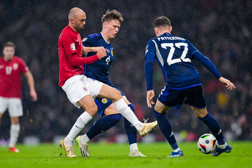 Aursnes em ação no jogo com a Escócia, de apuramento para o Euro-2024, em Glasgow. Foto: IMAGO