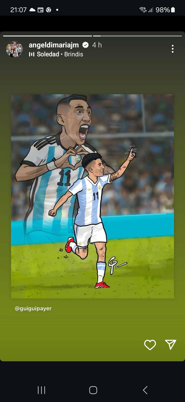 O único golo da partida foi apontado por Thiago Almada, médio criativo emprestado pelo Botafogo aos franceses do Lyon, e o jovem de 23 anos usa na camisola o mesmo número que pertencia a Di María na seleção e que o extremo continua a ter no Benfica. Di María destacou o pormenor nas redes sociais.
