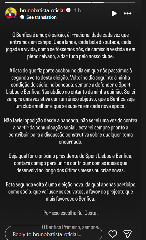 Bruno Batista, diretor de campanha e candidato a vice-presidente no pelouro de Marca, Comercial e Comunicação na lista de Luís Filipe Vieira nas eleições do Benfica de 25 de outubro, revelou no Instagram que vai votar em Rui Costa na segunda volta, contra João Noronha Lopes, depois da derrota do antigo máximo dirigente dos encarnados (13.86% dos votos).