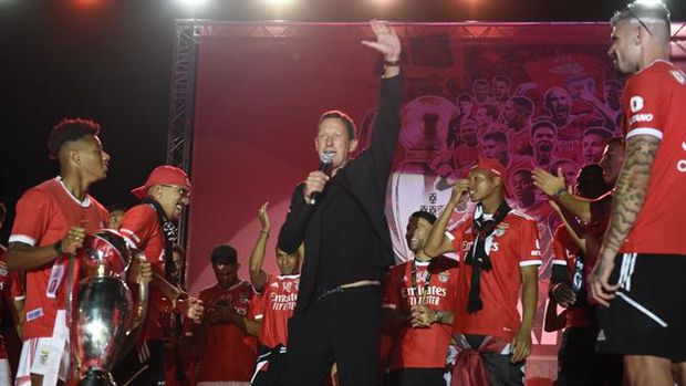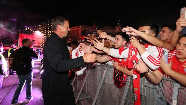 22h56: O momento em que Roger Schmidt, Rui Costa e Otamendi saem abraçados para o aplauso dos adeptos:
