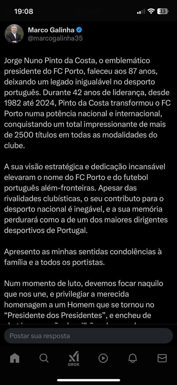 Marco Galinha, empresário que poderá apresentar uma candidatura à presidência do Benfica, afirmou, em comunicado, que as suas contas nas redes sociais foram alvo de ataque informático. Em causa, mensagem sobre a morte de Pinto da Costa, ex-presidente do FC Porto, que já não está visível.
