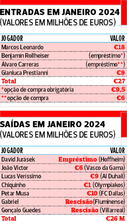 O Benfica fez o maior investimento de sempre no mercado de inverno. Mesmo que do ponto de vista contabilístico algumas contratações sejam apenas efetivadas no próximo exercício, o gasto em jogadores que chegaram em janeiro será de €42,5 milhões, valor que supera o anterior recorde registado em 2020, quando dos cofres da Luz saíram €20 milhões para adquirir o passe de um único jogador (Julian Weigl, do Dortmund).