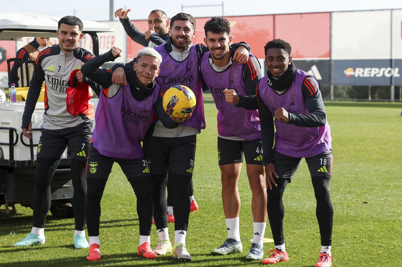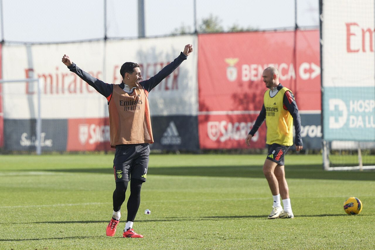 As fotografias partilhadas mostram sorrisos de Vangelis Pavlidis e Di María, mas uma acrobacia de Otamendi e o festejo de uma miniequipa composta por Prestianni, Kokçu, Tomás Araújo e Leandro Barreiro.