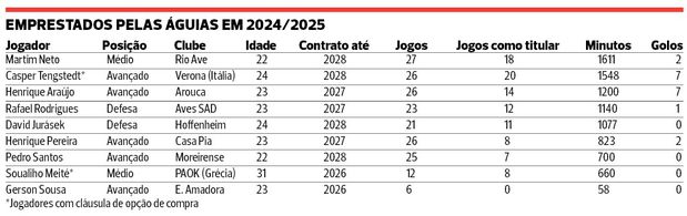 Martim Neto e Henrique Araújo jogaram mais, mas também têm mais experiência. O médio já tinha estado cedido em 2023/2024, ao Gil Vicente – onde jogou com mais regularidade do que em Vila do Conde, esta temporada. Já o ponta de lança, com 20 jogos pela equipa principal das águias, saiu da Luz pelo terceiro ano consecutivo (antes, passara seis meses pelo Watford e um ano pelo Famalicão), e até conseguiu o melhor rendimento como jogador emprestado, mas apenas com sete golos marcados, três dos quais de penálti.