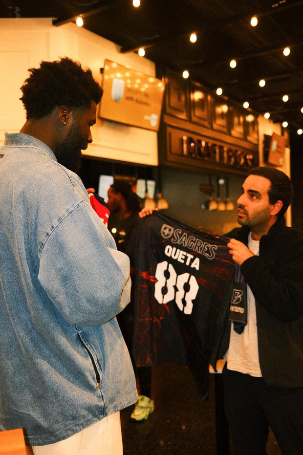 As ofertas incluíram a tradicional camisola vermelha e a edição especial preta desenhada por Vhils. Todas têm detalhes personalizados: as de Neemias ostentam o nome ‘Queta’ e o número 88, que utiliza na NBA; as do técnico levam ‘Mazzulla’ e o número 21, que Joe utilizava nos seus tempos de basquetebolista na Universidade de West Virginia. André Costa entregou o material a Neemias, que mais tarde ficou encarregue de surpreender o seu treinador.