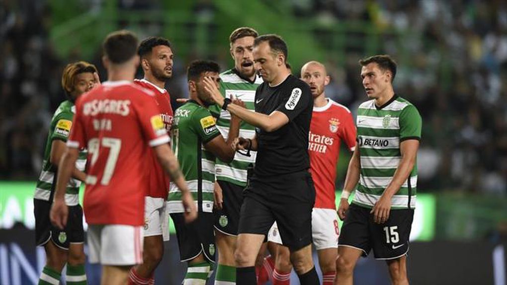 Aos 52', Benfica pediu grande penalidade por empurrão nas costas de Nuno Santos sobre Alexander Bah dentro da grande área. João Pinheiro e o VAR mandaram seguir.