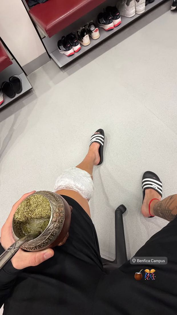 O pequeno argentino dos encarnados divulgou imagem no balneário, no centro de estágio do Seixal, bebendo mate (bebida tradicional para os sul-americanos), mas com o joelho esquerdo ligado.