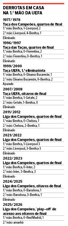 Há, depois, outro fator que adensa o grau de dificuldade e ensombra o sonho do Benfica em alcançar os oitavos de final: o peso do passado. Nas oito eliminatórias europeias anteriores (Taça/Liga dos Campeões, Taça UEFA/Liga Europa e Taça das Taças) em que perderam em casa na primeira mão, as águias foram eliminadas em sete delas.