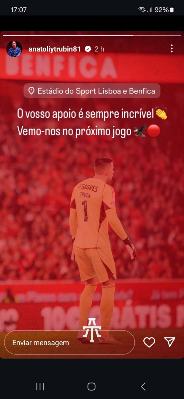 Anatoliy Trubin, guarda-redes internacional ucraniano do Benfica, recorreu esta quinta-feira às redes sociais para reforçar a determinação para o jogo de sábado, no Estádio da Luz, frente ao Casa Pia, e também a confiança que tem na massa associativa dos encarnados