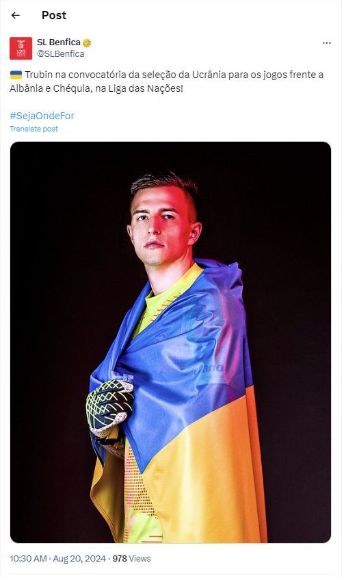 O guarda-redes Anatoly Trubin está convocado para representar a seleção da Ucrânia nos próximos dois jogos a contar para a Liga das Nações em setembro, informou o Benfica. No entanto, a convocatória surge numa altura em que o jogador faz parte de um extensa lista de lesionados no Benfica, com entorse lateral do tornozelo esquerdo.