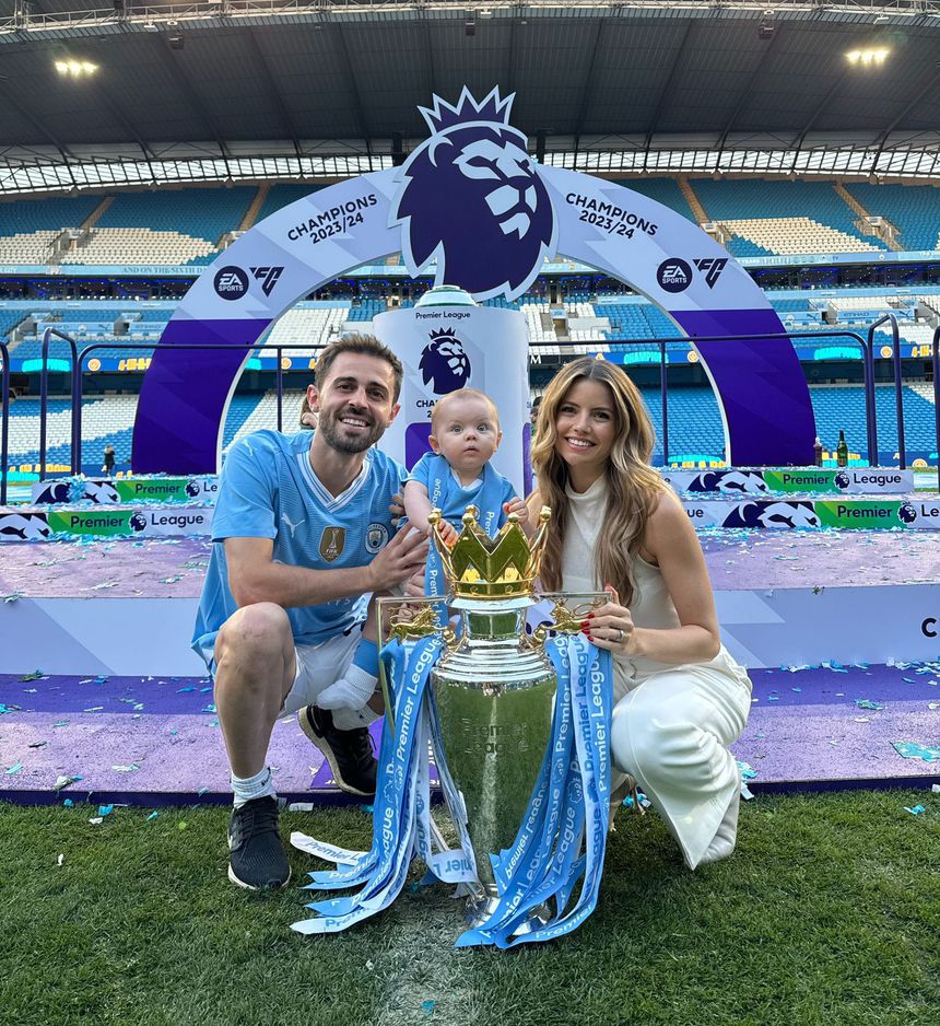 Depois de todos os festejos no relvado, Bernardo Silva posou em família, com a mulher, Inês Tomaz, e a filha Carlota junto à Taça de campeão inglês.
