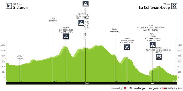 Na sexta-feira corre-se a sexta etapa, entre Sisteron e La Colle-sur-Loup, num percurso de 198,2 quilómetros, com cinco contagens de montanha (quatro de segunda categoria e uma de terceira).