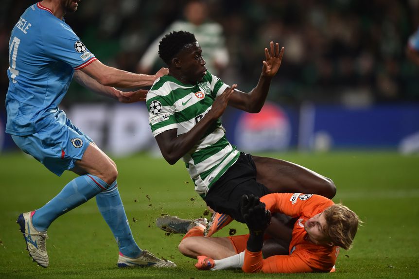 Salvador Blopa choca com Jackers, guarda-redes do Club Brugge- Foto: Miguel Nunes