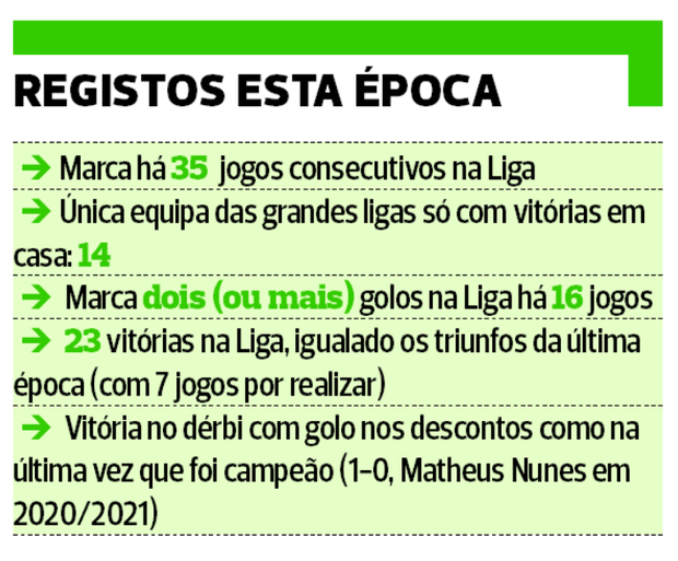 E os registos leoninos ultrapassam fronteiras, uma vez que é a única equipa das principais ligas com o pleno de vitórias em casa: 14 em 14 jogos, isto numa altura em que ainda faltam disputar três encontros no Estádio José Alvalade, diante de Vitória de Guimarães, Portimonense e Chaves, estas duas últimas a lutar pela manutenção.