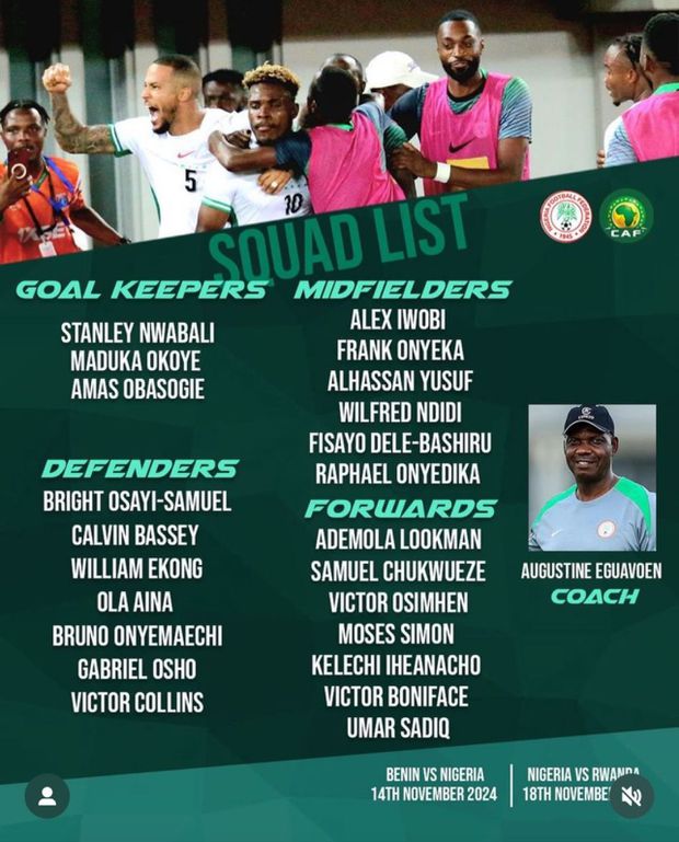A lista de convocados da Nigéria para os jogos com Benim e Ruanda