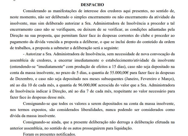 Caso não o faça, a Administradora de Insolvência terá poderes para ordenar o fim do Boavista sem necessidade de nova convocação da assembleia de credores, conforme se lê na ata da Assembleia de Credores do passado dia 16 a que A BOLA teve acesso.