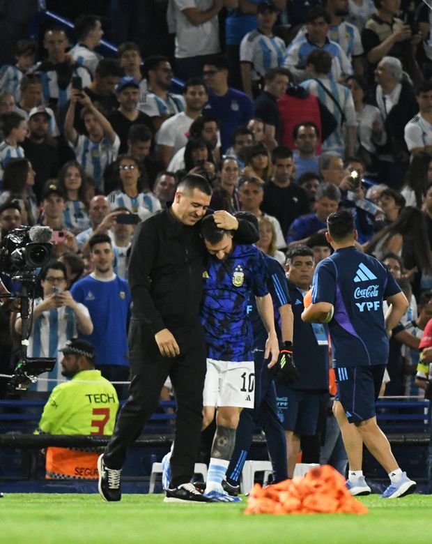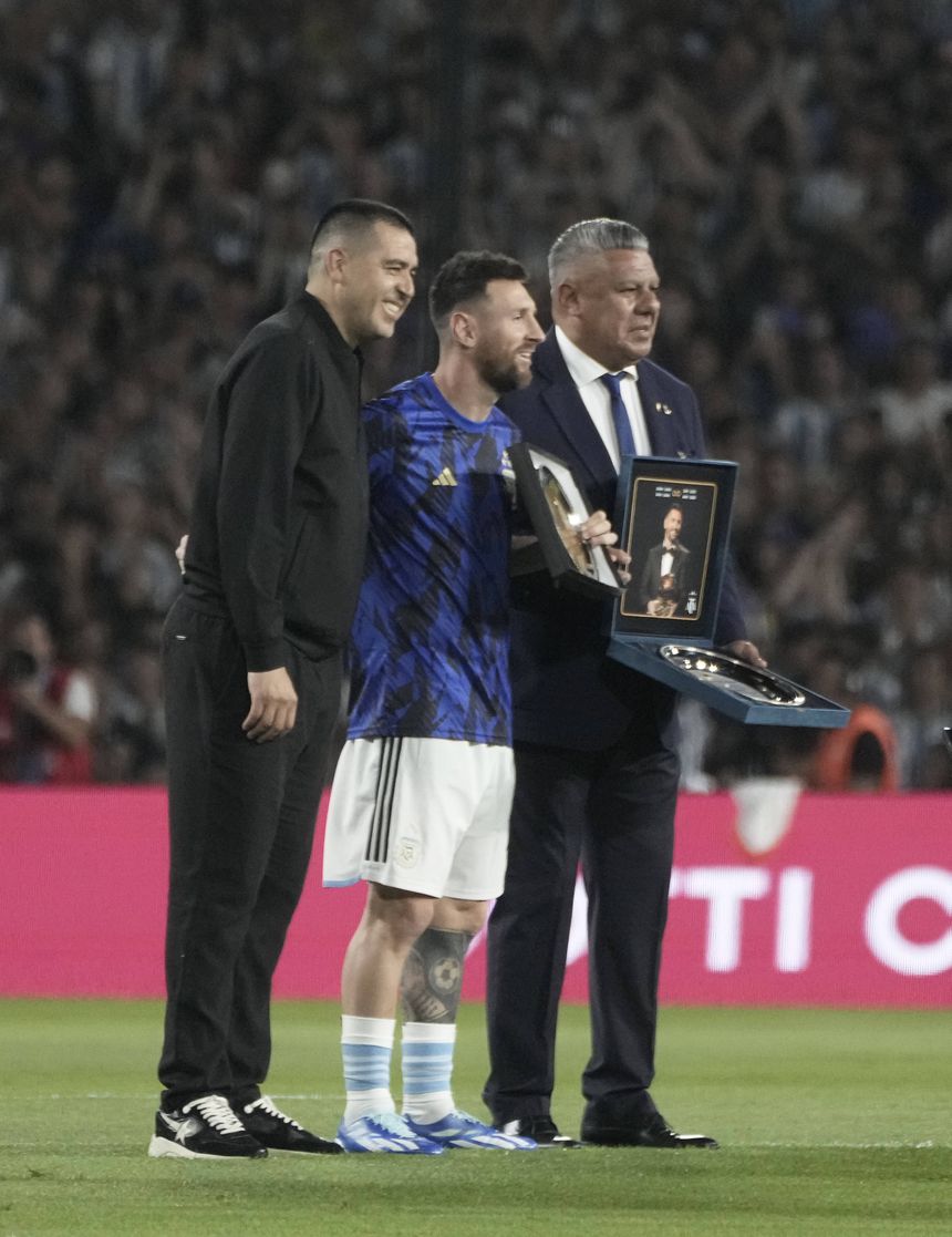 No relvado, o astro argentino recebeu uma medalha de coroação das mãos de Claudio Tapia, presidente da Federação Argentina de Futebol, acompanhado por Juan Román Riquelme, antigo futebolista e atual vice-presidente do Boca Juniors.