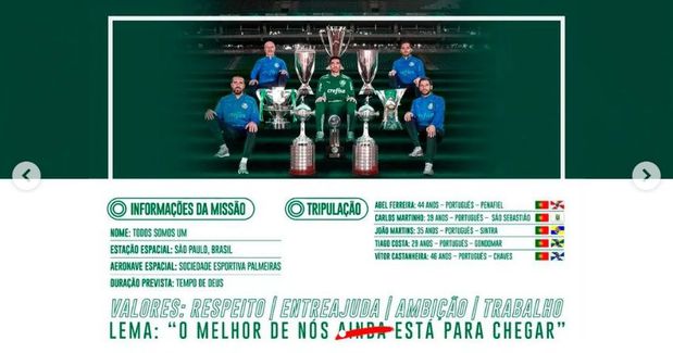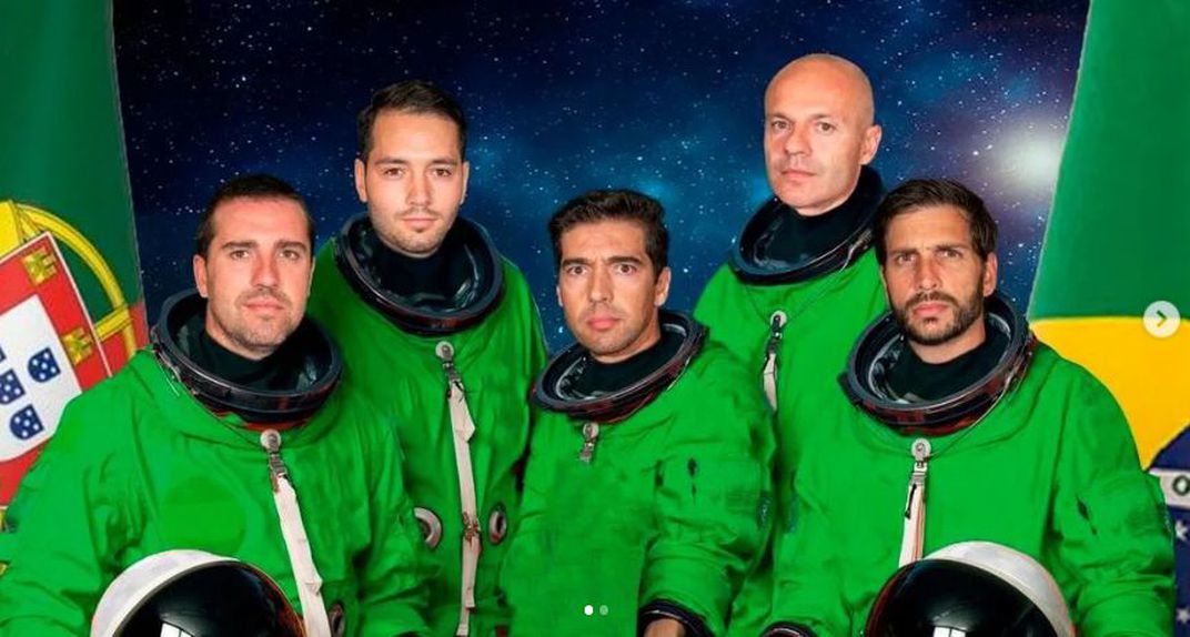 O treinador português publicou uma foto da equipa técnica vestida com fatos de astronautas, preparados para a missão que é comandar o Palmeiras. Destaque para um pormenor: a duração da missão está atribuída ao «tempo de Deus».