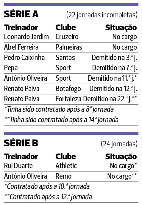 Na Série B, entretanto, não havia nenhum no arranque da prova mas agora trabalham por lá António Oliveira, que recebeu voto de confiança após a última jornada do dirigente Marcos Braz, ex-Flamengo, no sexto classificado Remo, e Rui Duarte, no Athletic, de São João del-Rei, clube estreante no segundo escalão brasileiro que segue no 15º lugar.