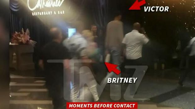 Segundo testemunhas, citadas pelo site TMZ, e depois por relato da própria, Britney aproximou de Victor por trás e deu-lhe um toque nas costas, mas foi agredida por Damian Smith, diretor de segurança dos Spurs, logo em seguida. Outras versões dizem que a cantora agarrou o jogador de 2,25metros, o que terá motivado a intervenção musculada de Smith.