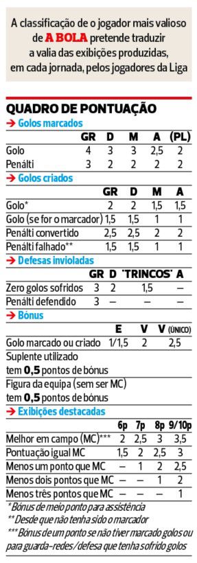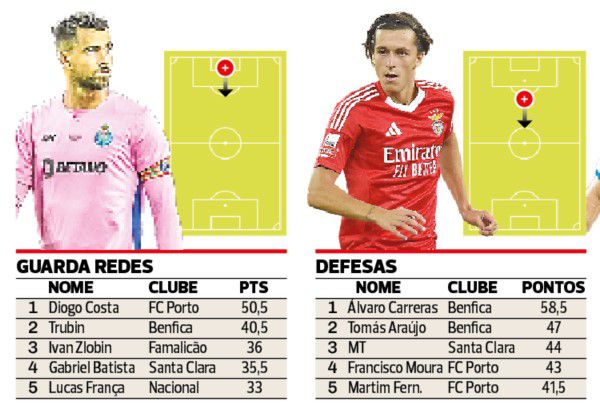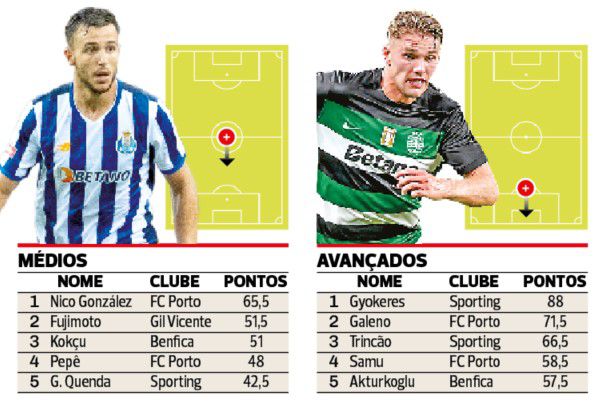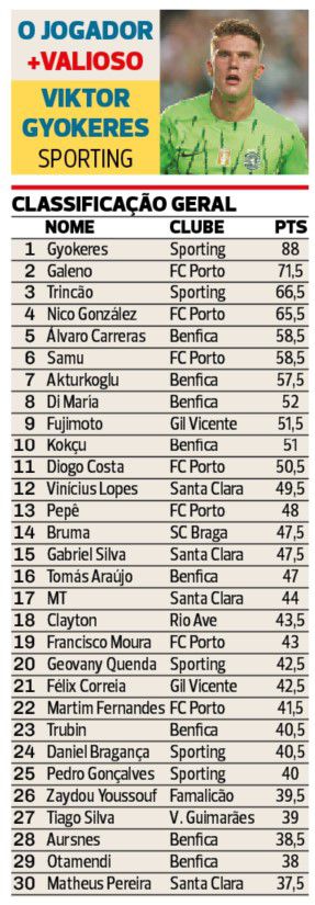 Esta foi a segunda jornada em que Viktor Gyokeres não somou qualquer ponto na época — só ficara em branco na derrota caseira diante do Santa Clara na 12.ª ronda —, mas o sueco mantém-se destacado no topo da classificação de O jogador mais valioso de A BOLA da Liga. Nos lugares cimeiros menção para Nico González (4.º), há sete jornadas o médio mais valioso da prova e cada vez mais perto do pódio. Numa ronda que viu Kokçu (10.º) entrar no top-10, merecem destaque as subidas de Bruma (saltou 11 lugares para ser 14.º) e Tomás Araújo, agora 16.º e segundo entre os defesas.