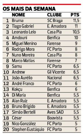 Destaque também para o central gigante Tiago Gabriel, autor do golo do triunfo amadorense na Reboleira; o lateral Leonardo Lelo, o melhor em campo em Rio Maior onde marcou e assistiu; e Amdouni, a saltar do banco para bisar na vitória encarnada.