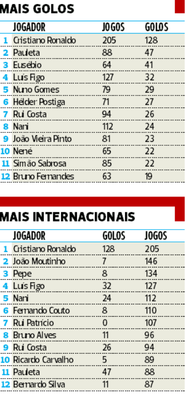 Bruno Fernandes está agora a três golos de Nené e Simão Sabrosa, que partilham o 10.º lugar da lista. João Vieira Pinto, 9.º, está a quatro golos de distância, e Nani, 8.º, a cinco. Com 29 anos, feitos em setembro, e média de 0,3 golos por internacionalização, o número 8 de Portugal precisará, em teoria, de apenas mais 20 partidas para chegar a esse oitavo lugar - e nem o 4.º de Luís Figo (32 golos) parece seguro.