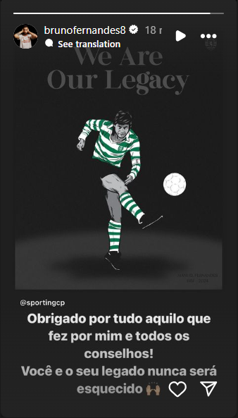 Numa publicação na sua conta de Instagram, o internacional português (que passou pelo Sporting entre 2017 e 2020) agradeceu ao Eterno Capitão leonino pelos ensinamentos: «Obrigado por tudo aquilo que fez por mim e todos os conselhos! Você e o seu legado nunca serão esquecidos.»