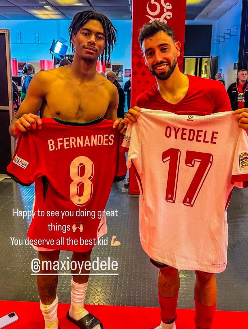 O médio tem impressionado esta época no Légia Varsóvia, mas antes disso passou pela formação do Manchester United, algo que Bruno Fernandes, capitão da equipa principal dos red devils, não esqueceu após o jogo. Através das redes sociais, o médio português mostrou que trocou de camisola com Oyedele.