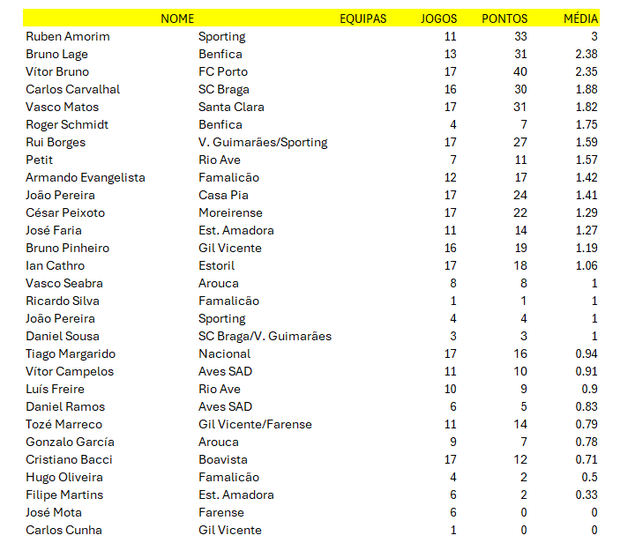 Exercício interessante vermos as médias pontuais dos 29 treinadores que orientaram as 18 equipas até final da primeira volta, que ficou concluída com o Nacional-FC Porto. Para Rui Borges, Daniel Sousa e Tozé Marreco fazemos o agregado de V.Guimarães/Sporting, SC Braga/V.Guimarães e Gil Vicente/Farense. Marreco, repete-se, não chegou a orientar os gilistas em jogos oficiais de 2024/2025.