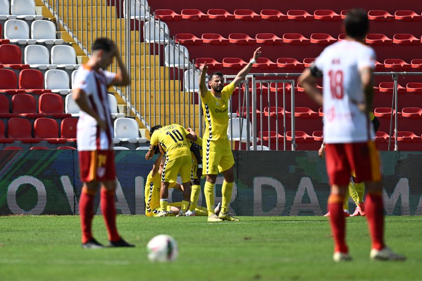 Os jogadores do Nacional festejam o golo marcado na Vila das Aves. Imagem: FERNANDO VELUDO/LUSA