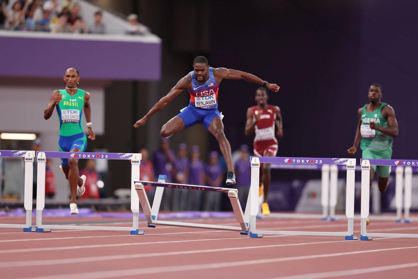 Foi um dia atarefado para Rai Benjamin, o novo campeão do Mundo de 400 metros barreiras.