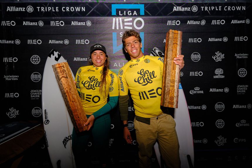 Campeões nacionais de 2023, Joaquim Chaves, primeiro título, e Francisca Veselko, bicampeã, vestem a licra amarela de líderes do ranking Go Chill no Figueira Pro, prova que representa a 10ª edição da Allianz Triple Crown, sub-troféu que premeia os surfistas com os melhores resultados na Figueira da Foz, Ericeira e Ribeira Grande, Açores.
