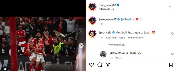 Quando a publicação tinha poucos minutos, saltou à vista uma mensagem. «Meu bolinha, o que tu jogas», escreveu João Cancelo, ex-Benfica e agora no Barcelona.